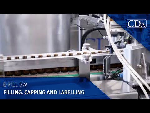 The E-Fill SW monobloc from CDA is designed to fill, cap, and label bottles containing a variety of liquid and viscous products, including e-liquids, essential oils, flavors, colorants, pharmaceutical reagents, and many more. It supports formats ranging from 5 ml to 250 ml (other formats can be validated based on the project and desired production rates).